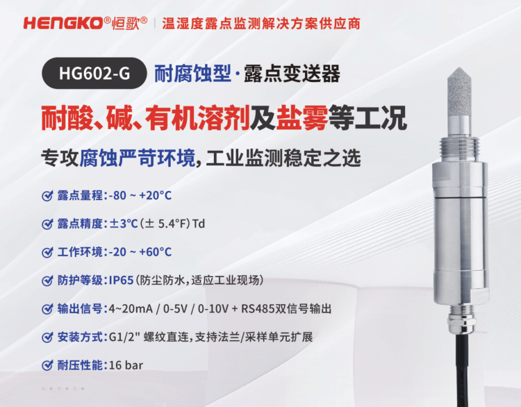 恒歌HG 602-G耐腐蚀露点仪专为解决此类难题而生,采用三重防护设计,为工业用户提供高精度、长寿命的露点监测方案。