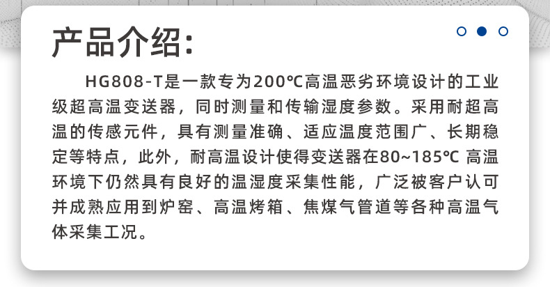 HG808-T系列高温温湿度变送器是专为工业高温场景打造的高端温湿度监测装备,采用耐200°C超高温传感器核心,铸铝外壳壳体配合不锈钢探护组件,在高温高压、油气粉尘等极端工况下仍能保持±2.5%RH湿度精度。